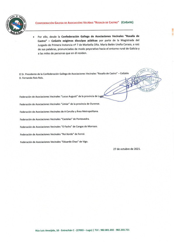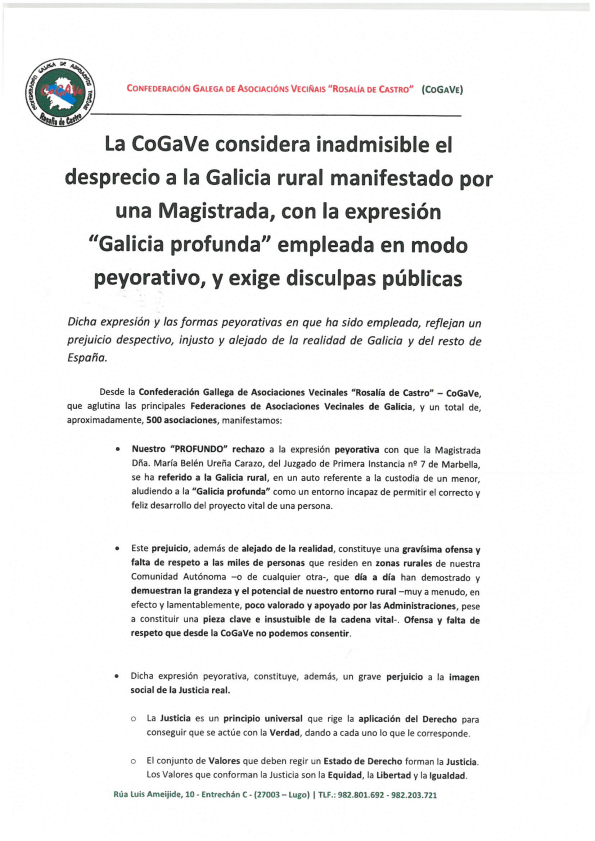 Comunicado oficial de la CoGaVe, sellado y firmado, enviado a los medios de comunicación, denunciando las formas peyorativas con que ha sido empleada la expresión «Galicia profunda» por parte de una Magistrada, y exigiendo disculpas públicas por ello.