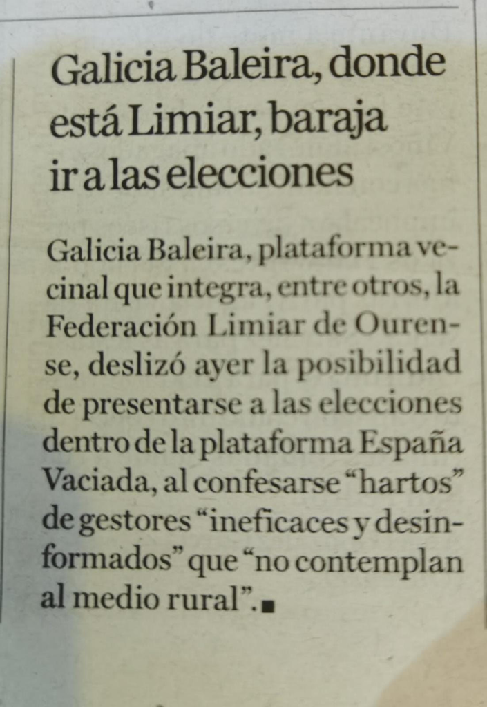 La Plataforma «Galicia Baleira» -que aglutina las Federaciones de Asociaciones Vecinales «Lucus Augusti» de la provincia de Lugo y «Limiar» de la provincia de Ourense-, baraja ir a las elecciones by Cogave Cogave | Abr 19, 2022 | Novas | 0 comments FUENTE: LA REGIÓN 19/04/2022. Submit a Comment Cancelar la respuestaTu dirección de correo electrónico no será publicada. Los campos obligatorios están marcados con *Comentario Nombre * Correo electrónico * Web Guarda mi nombre, correo electrónico y web en este navegador para la próxima vez que comente.