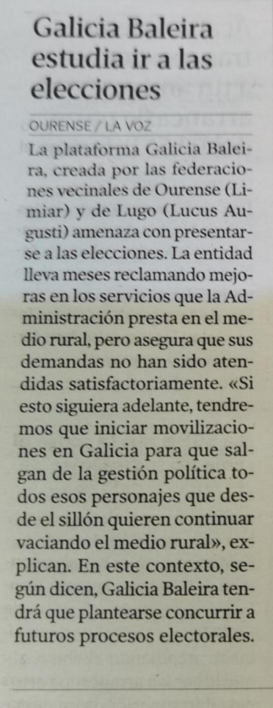 La Plataforma «Galicia Baleira» -que aglutina las Federaciones de Asociaciones Vecinales «Lucus Augusti» de la provincia de Lugo y «Limiar» de la provincia de Ourense-, estudia ir a las elecciones by Cogave Cogave | Abr 19, 2022 | Novas | 0 comments FUENTE: LA VOZ DE GALICIA. EDICIÓN OURENSE. 19/04/2022. Submit a Comment Cancelar la respuestaTu dirección de correo electrónico no será publicada. Los campos obligatorios están marcados con *Comentario Nombre * Correo electrónico * Web Guarda mi nombre, correo electrónico y web en este navegador para la próxima vez que comente.