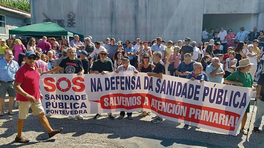 La concentración, convocada por la Asociación Galega para a Defensa da Sanidade Pública, tuvo lugar a las puertas del centro de salud de Baltar, en la localidad de Portonovo (Sanxenxo), donde corearon cánticos como “lo público es servicio, lo privado, beneficio”. La protesta contó con la participación de representantes de distintas organizaciones sociales, sindicales y políticas, entre ellas representantes de BNG y PSOE.