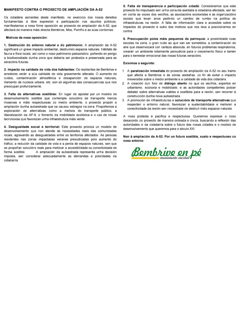 A Federación de Asociacións Veciñais de Vigo «Eduardo Chao» -Favec-, membro da CoGaVe, subscribe o manifesto da Plataforma Veciñal ‘Bembrive en pé’ contra o proxecto de ampliación da A-52. by Cogave Cogave | Ene 30, 2025 | Novas | 0 comments Submit a Comment Cancelar la respuestaTu dirección de correo electrónico no será publicada. Los campos obligatorios están marcados con *Comentario Nombre * Correo electrónico * Web Guarda mi nombre, correo electrónico y web en este navegador para la próxima vez que comente.