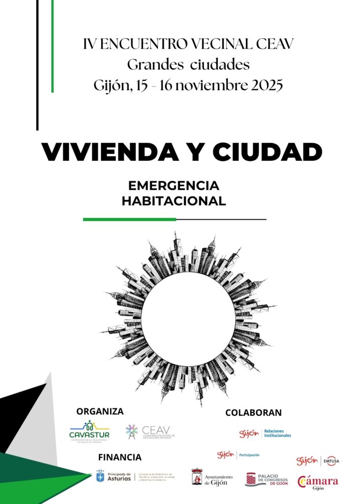 A Confederación Estatal de Asociacións Veciñais (CEAV) celebrará os días sábado 15 e domingo 16 de novembro en Xixón un encontro baixo o lema “Vivenda e cidade: emerxencia habitacional”, no que se busca situar o dereito á vivenda no centro do debate público e promover o intercambio de experiencias entre entidades veciñais de todo o Estado para avanzar cara a solucións innovadoras e xustas.